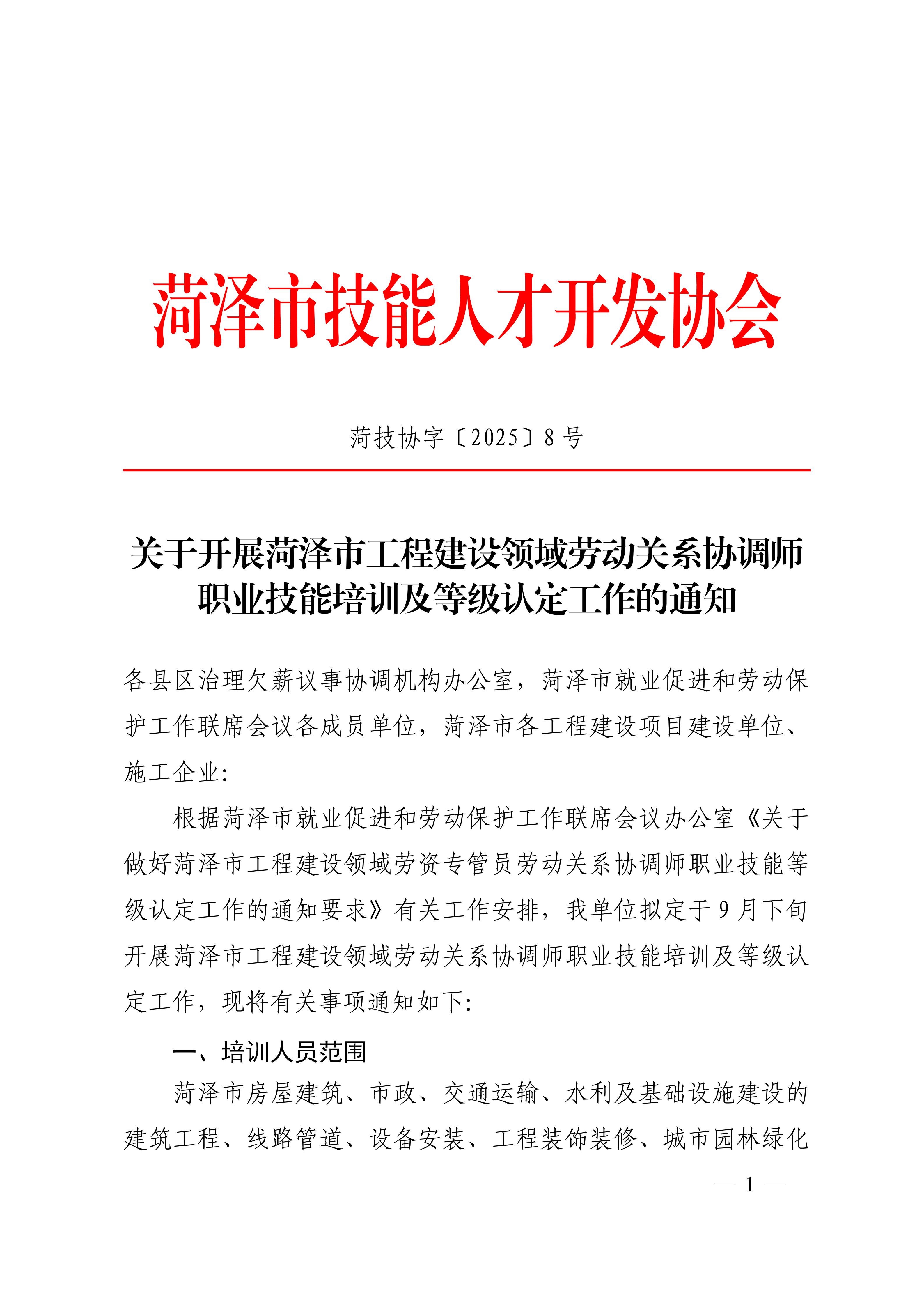 关于开展菏泽市工程建设领域劳动关系协调师 职业技能培训及等级认定工作的通知